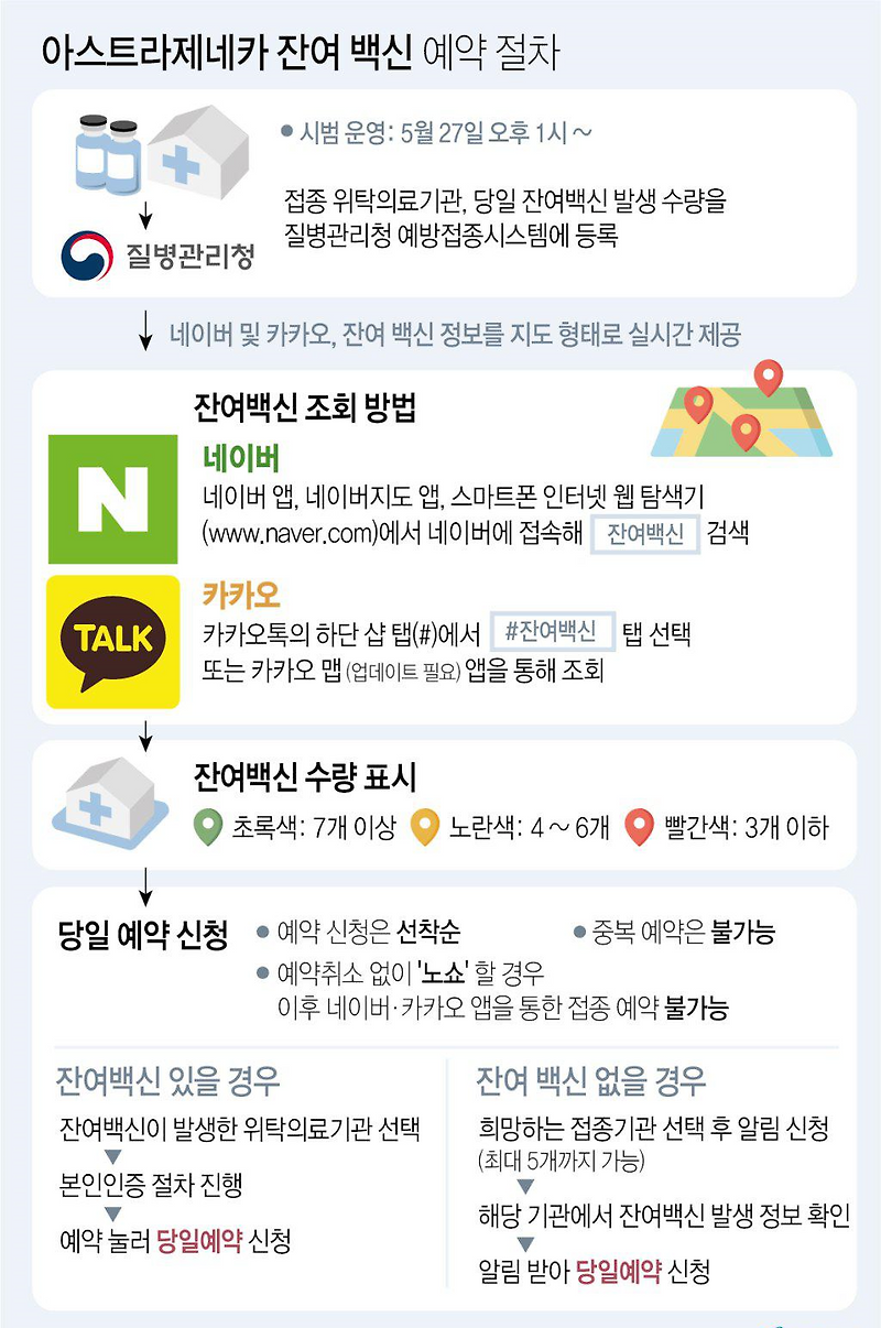 9 27일부터 '잔여백신' 당일예약 가능. 27일부터 앱으로 잔여백신 당일 예약 가능 24건. 네이버와 카카오를 통해 실시간 접종 신청이 가능하다고 했지만. 여름엔 마스크 벗고 싶은데…잔여백신 예약 오늘도 '0' : 오세훈 시장도 아스트라제네카 백신 접종.